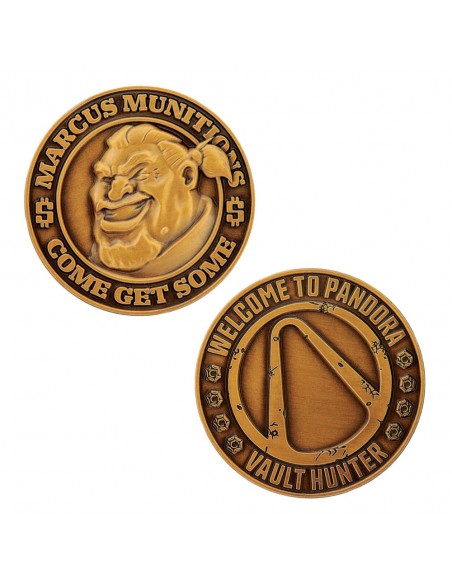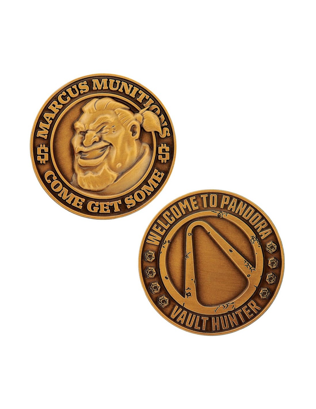 Esta moneda de Borderlands de edición limitada muestra a Marcus en el anverso y el símbolo de la V invertida de la Bóveda en el reverso. Cada moneda está numerada individualmente hasta el borde y está limitada a 5000 unidades en todo el mundo.
