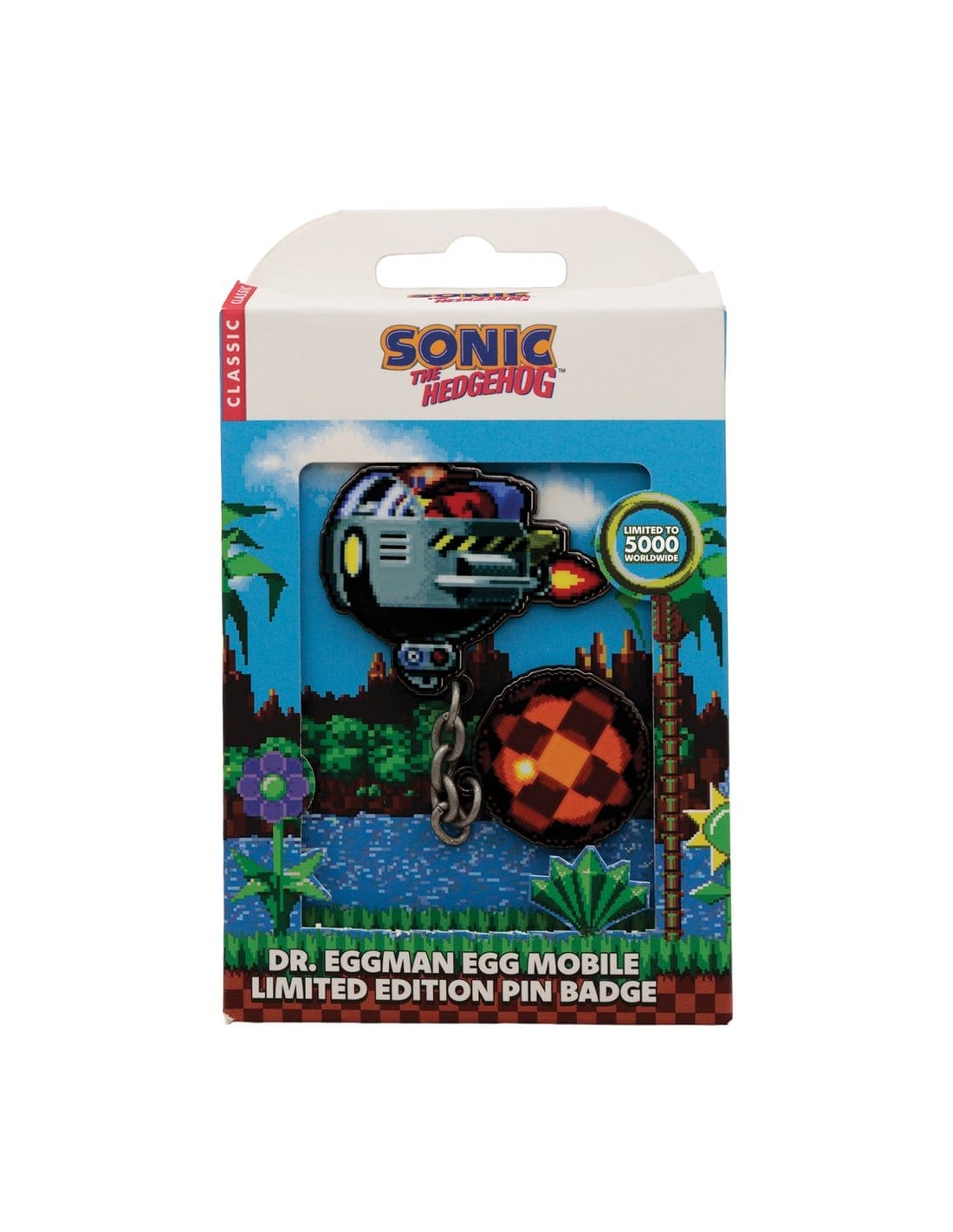Esta insignia con cadena de edición limitada representa el Egg Mobile tal como se vio en el primer juego de Sonic hace 35 años, y está conectada por una cadena a una de sus armas: una bola de demolición. Cada insignia está numerada individualmente en la bola de demolición, como una de las 5000 que existen en todo el mundo.