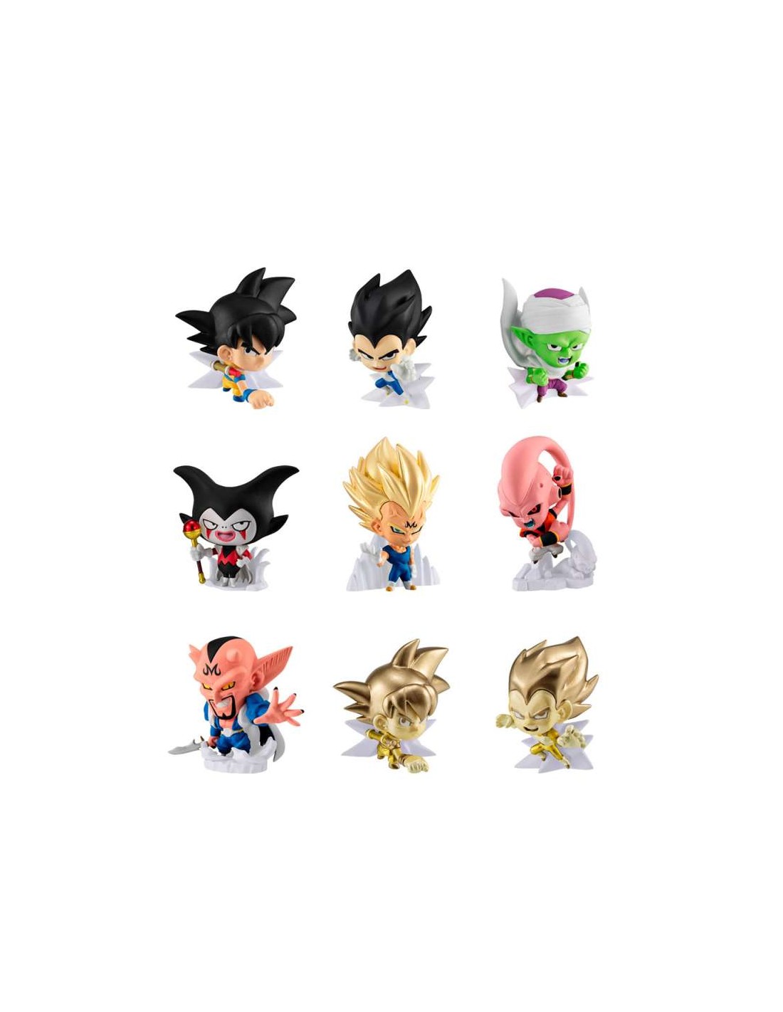 ¡Prepárate para disfrutar de una nueva y sorprendente colección de mini figuras! ¡Gracias a este genial Dragon Ball Mini Figura Sorpresa Super Warrior de Bandai! Consigue estas nuevas mini figuras sorpresa (se venden por separado) de los protagonistas de Dragon Ball en sus diferentes etapas. Goku, Vegeta, Piccolo, Majin Vegeta, Boo, Dabra y Gomah son las figuras que te pueden tocar y que completan esta genial colección, además de las versiones doradas de Goku y Vegeta.