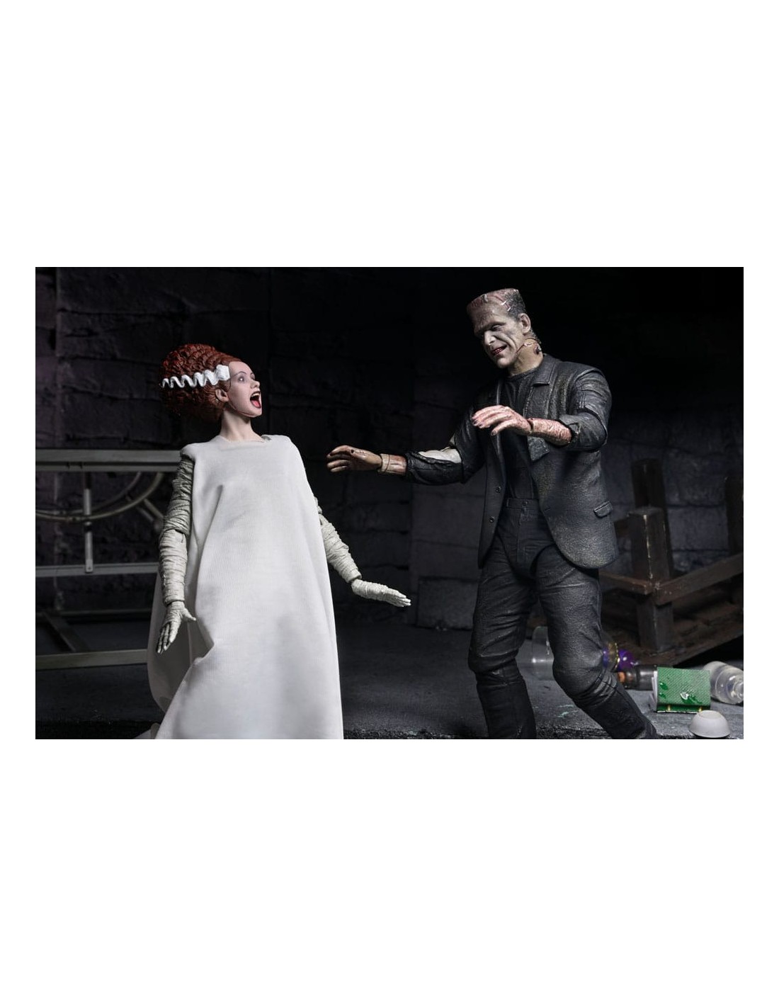 Celebra 90 años de terror clásico y romance condenado con este conmovedor homenaje a la clásica película de Universal Monsters, ¡La Novia de Frankenstein! NECA presenta con orgullo un pack de dos figuras de acción conmemorativas que reúne al Monstruo de Frankenstein y a su Novia en un electrizante set de coleccionista. Cuando el Monstruo conoce a su verdadero amor y descubre que sus sentimientos no son correspondidos, acciona el interruptor que implosiona el castillo, poniendo fin a su trágica historia de amor antes de que siquiera comience.