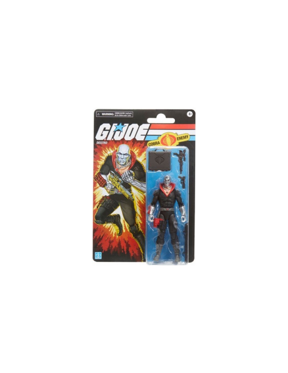 Hasbro dentro de su línea de G.I. Joe retro collection nos presenta la figura de Destro que viene lista para la acción, con múltiples puntos de articulación que otorga a la figura distintas poses. La figura viene además con 3 accesorios inspirados en el personaje y su altura aproximada es de 15cm.