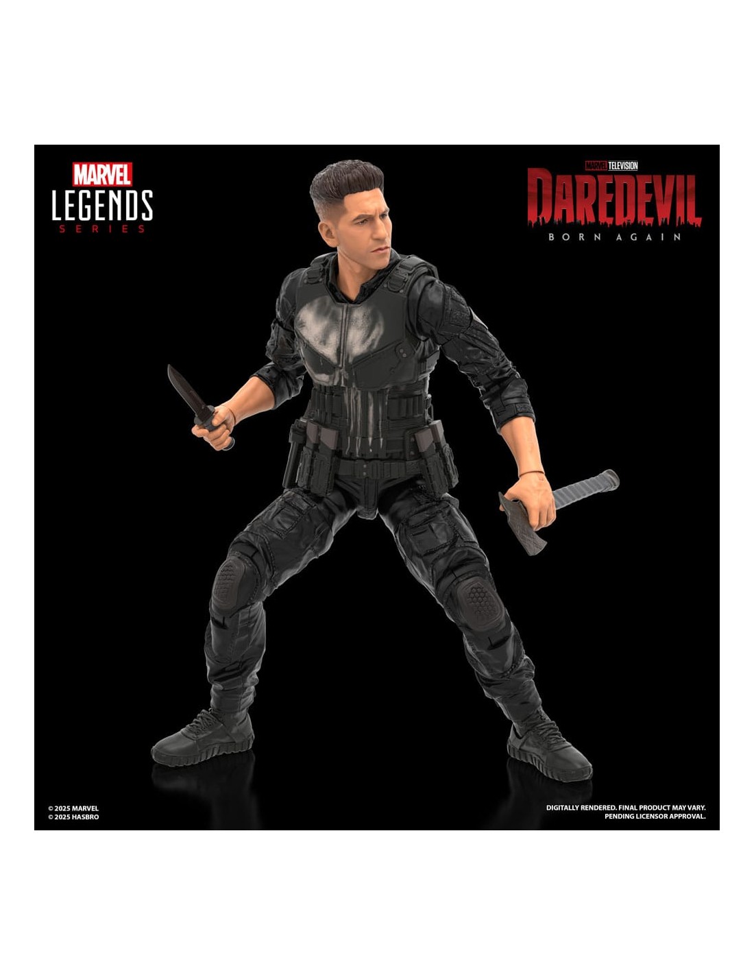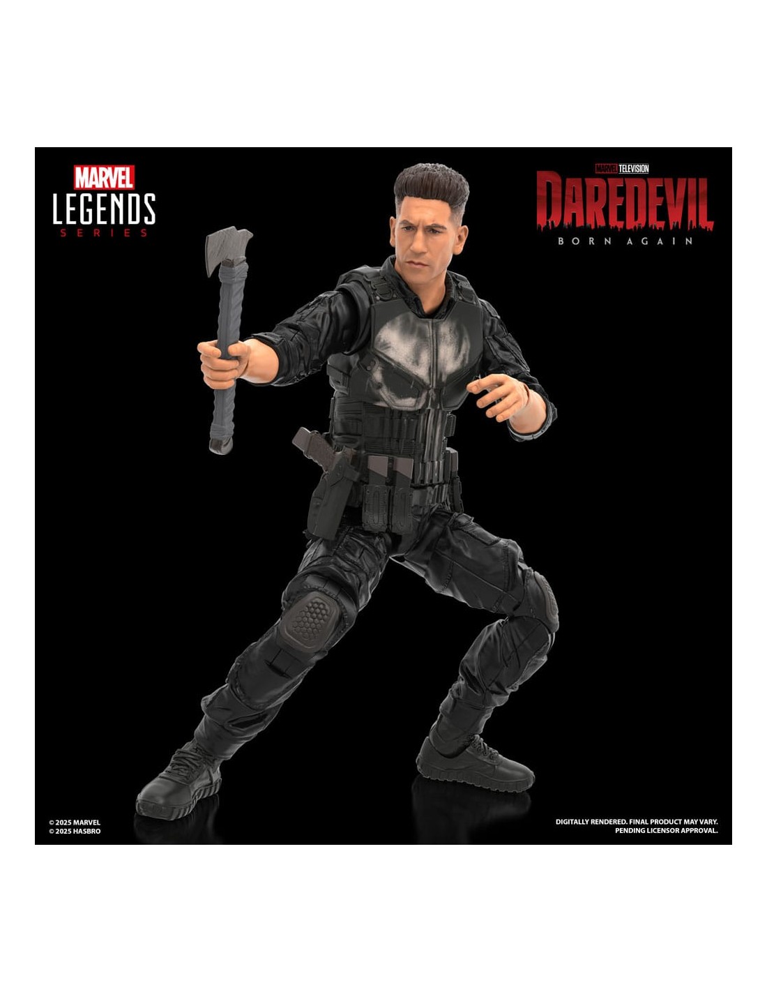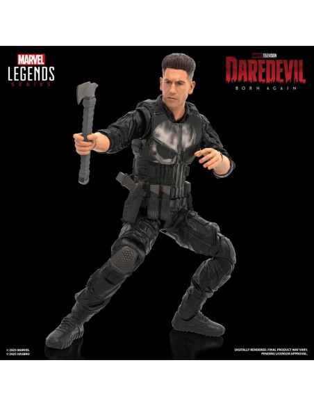 Hasbro incorpora a su colección Marvel Legends Series esta figura articulada de Punisher, basada en su aparición en la serie "Daredevil: Born Again" de Disney +. Mide 15 cm e incluye 5x accesorios: 1x set de manos alternativas, 1x hacha, 1x cuchillo y 1x pistola. Cuenta con más de 20 puntos de articulación y un diseño premium, ideal para recrear poses dinámicas. Se presenta en una caja con ventana.
