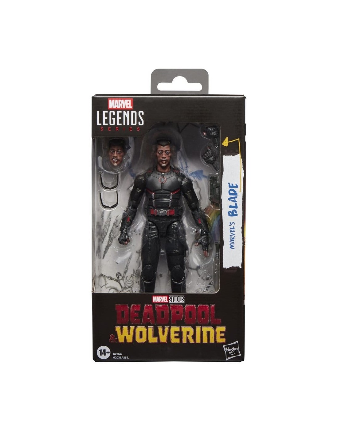 ¡Trae la emoción y la maravilla del Universo Marvel a tu colección con la figura de acción Marvel's Blade de la línea Marvel Legends de Hasbro! Esta figura Marvel coleccionable tiene una escala de 15 cm y está inspirada en la apariencia del personaje en la película Deadpool & Wolverine de Marvel Studios. Esta figura de Marvel's Blade es fácilmente articulable y cuenta con diseño premium y cabeza, brazos y piernas articulables. Este set de figura Marvel viene con 7 accesorios, incluyendo una cabeza alternativa, 2 pares de gafas de sol, un set de manos alternativas, cuchillo y arma. Las figuras de acción Marvel de Hasbro a escala de 15 cm son ideales para exhibirlas en las colecciones de los fans. Reimagina escenas inspiradas en la película en tus estantes con las figuras de acción Marvel Legends y los artículos de colección de Marvel.