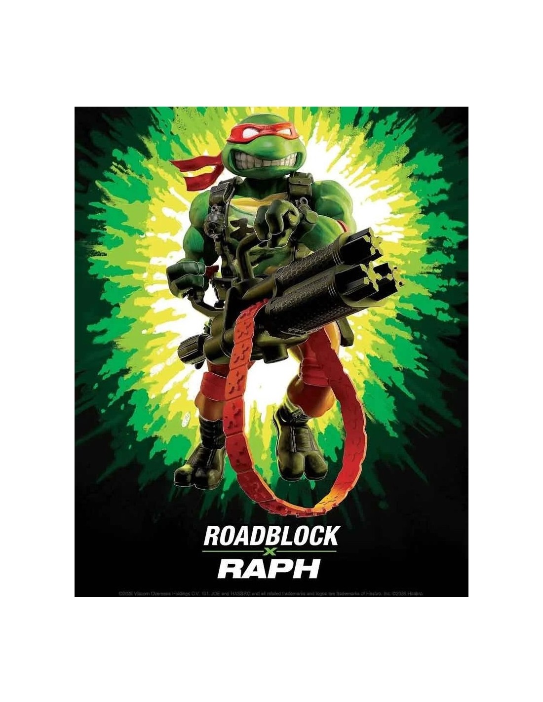 Figura de acción de Raphael x Roadblock forma parte de la línea Teenage Mutant Ninja Turtles x G.I. Joe Crossover Classics de Playmates. La figura mide aproximadamente 12 cm de alto y viene con un rifle pesado, equipo de combate y un cinturón de herramientas.