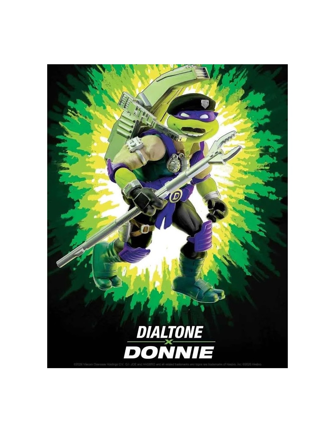 Figura de acción de Donatello x Dial-Tone forma parte de la línea Teenage Mutant Ninja Turtles x G.I. Joe Crossover Classics de Playmates. La figura mide aproximadamente 12 cm de alto y viene con un rifle tecnológico, equipo de comunicaciones y un arnés de equipo.