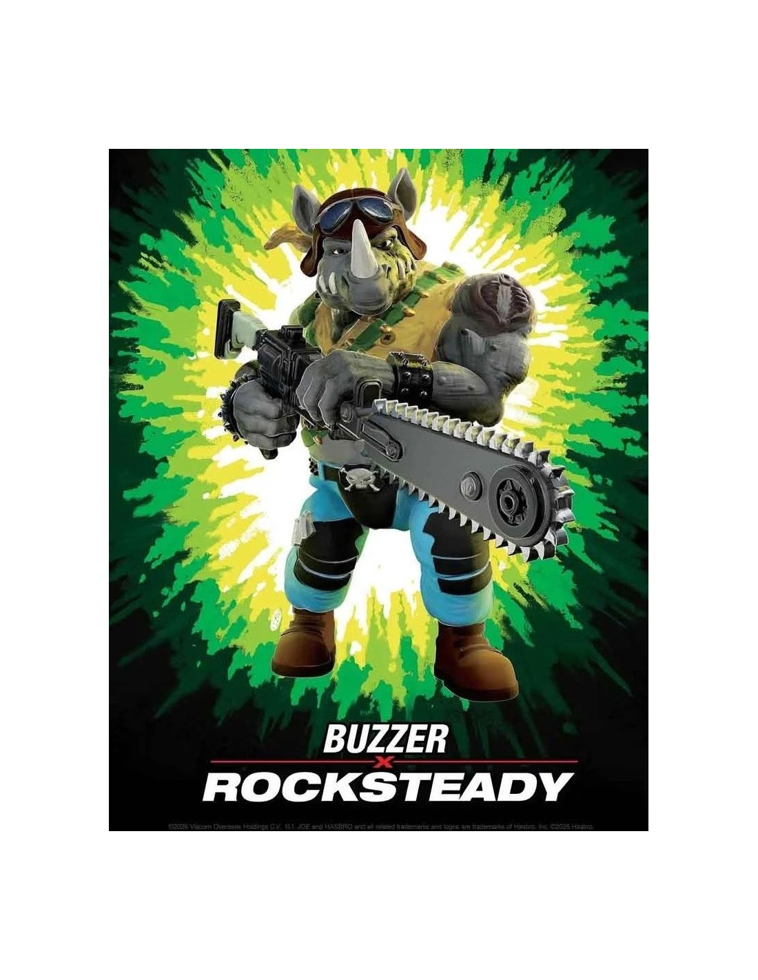 Figura de acción de Rocksteady x Dreadnok Buzzer forma parte de la línea Teenage Mutant Ninja Turtles x G.I. Joe Crossover Classics de Playmates. La figura mide aproximadamente 12 cm de alto y viene con un arma pesada y accesorios de armadura.