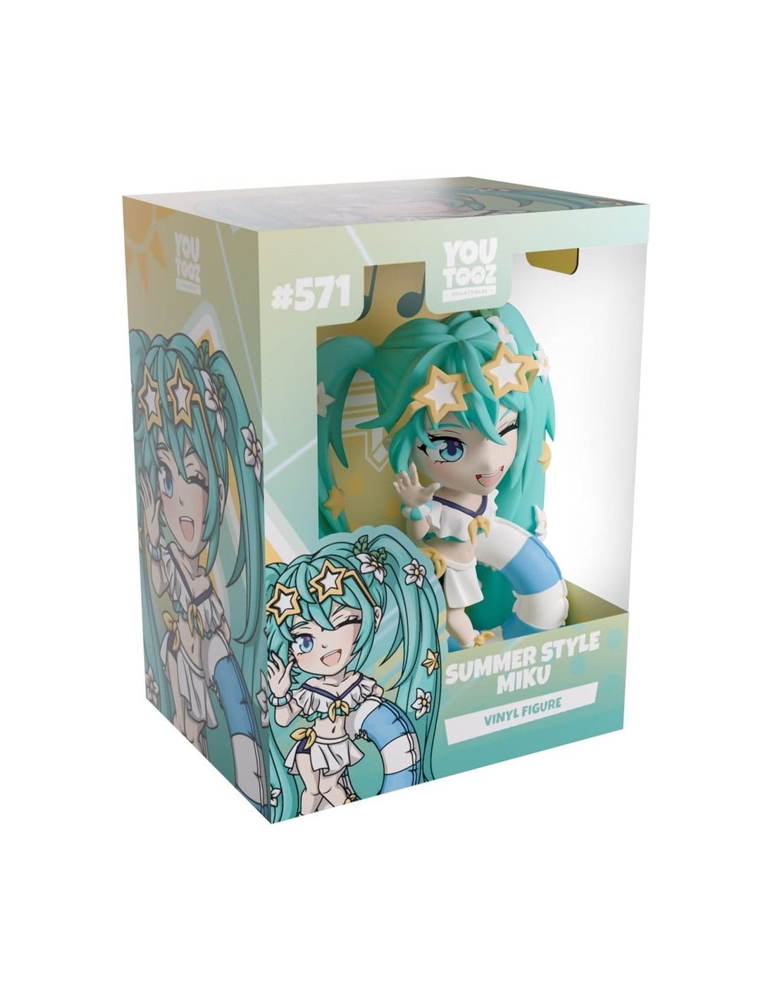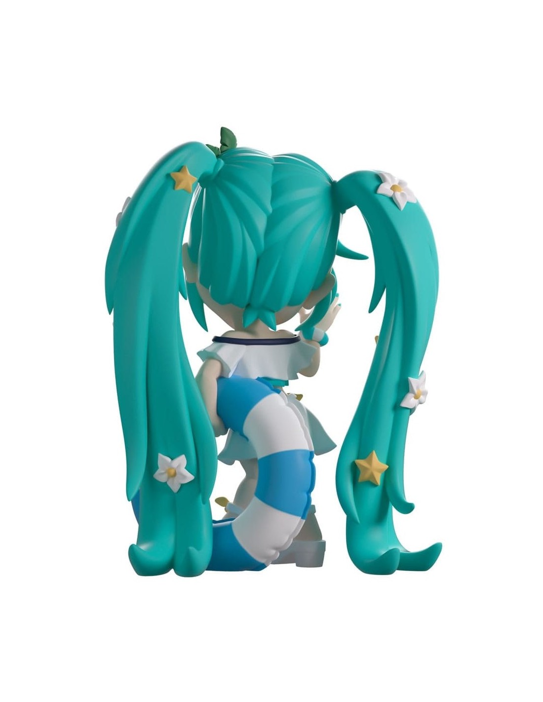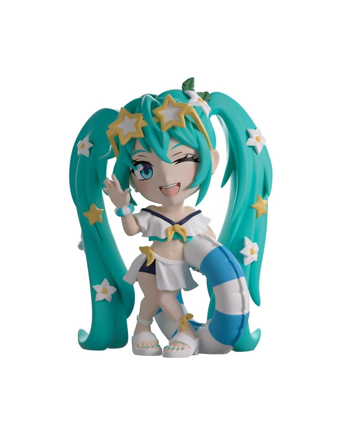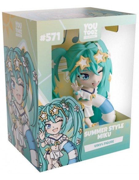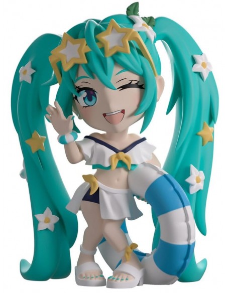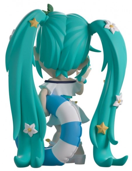 ¡Miku está lista para darse un chapuzón en la playa con su regreso a Youtooz! Mide 12 cm, levanta la mano derecha y sostiene un flotador inflable de rayas azules y blancas bajo el brazo izquierdo. Lleva gafas con forma de estrella sobre la frente y el flequillo, que enmarca su rostro sonrojado.