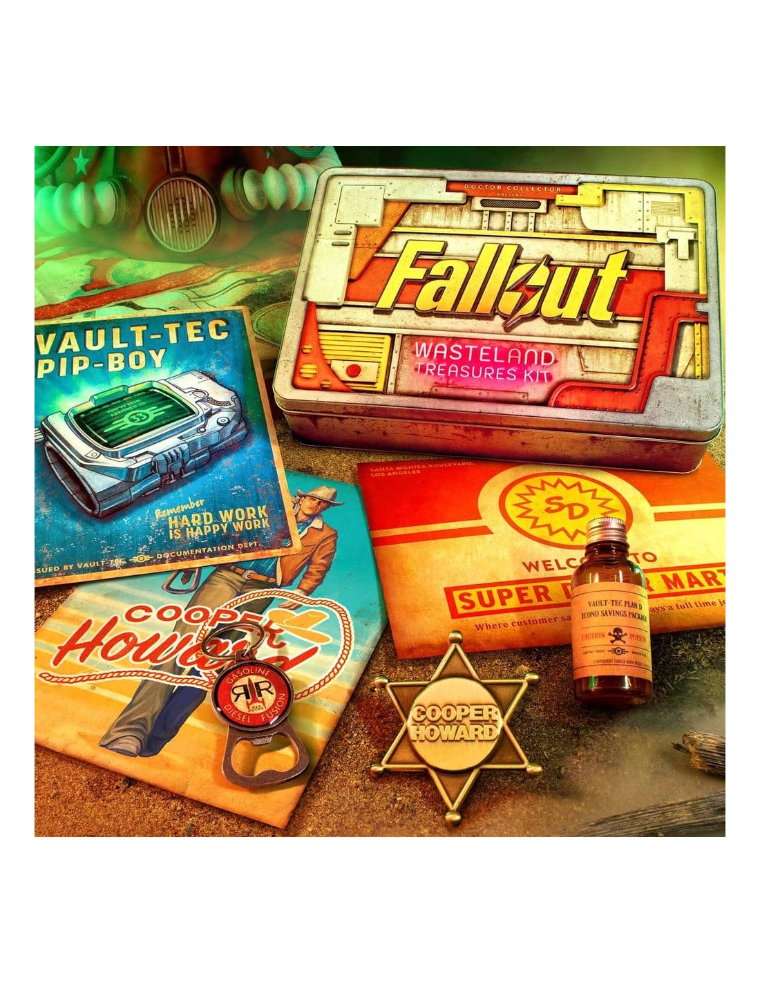 Es hora de cruzar el Yermo junto a Cooper Howard, "El Ghoul". Abrir el Kit de Tesoros del Yermo es como abrir una caja fuerte olvidada en medio del desierto y encontrar dentro los mayores tesoros del universo Fallout, rescatados de antes (y después) de la caída de las bombas.