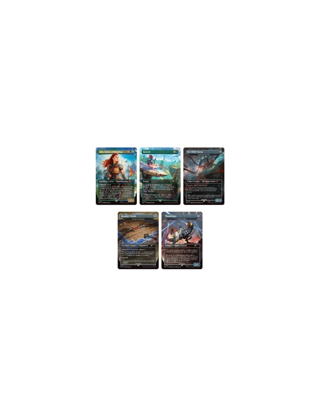 En 2022, los jugadores regresaron a las exuberantes tierras salvajes del posapocalipsis como Aloy en Horizon Forbidden West. Entre fronteras letales, Aloy se enfrentó a nuevas amenazas de las peligrosas máquinas que vagan por las tierras salvajes, así como al pasado olvidado del Viejo Mundo. Junto a sus aliados, luchó por un futuro mejor, y ahora lucha contigo como parte de tu mazo de Magic: The Gathering. Además de una nueva carta de Magic protagonizada por la mayor cazadora de máquinas del mundo, la entrega de Secret Lair x Horizon: Into the Forbidden West